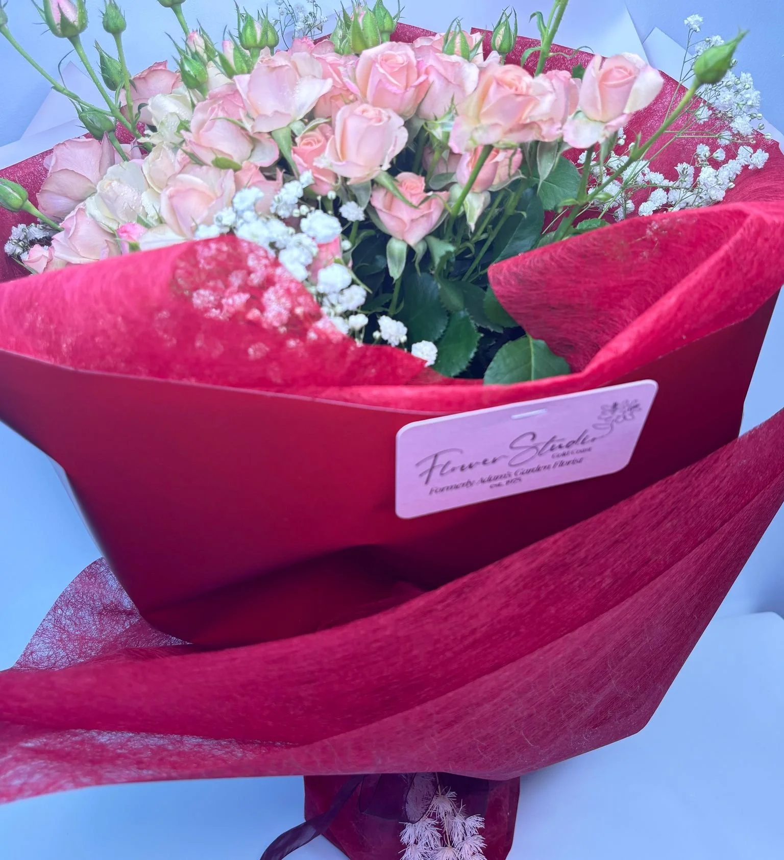 Elevate your expression of love with our enchanting bouquet featuring our pink or red mini spray roses complimented with our signature gift wrap. This delicate & dreamy bouquet whispers romance, making it the perfect gesture to captivate hearts on any special occasion!